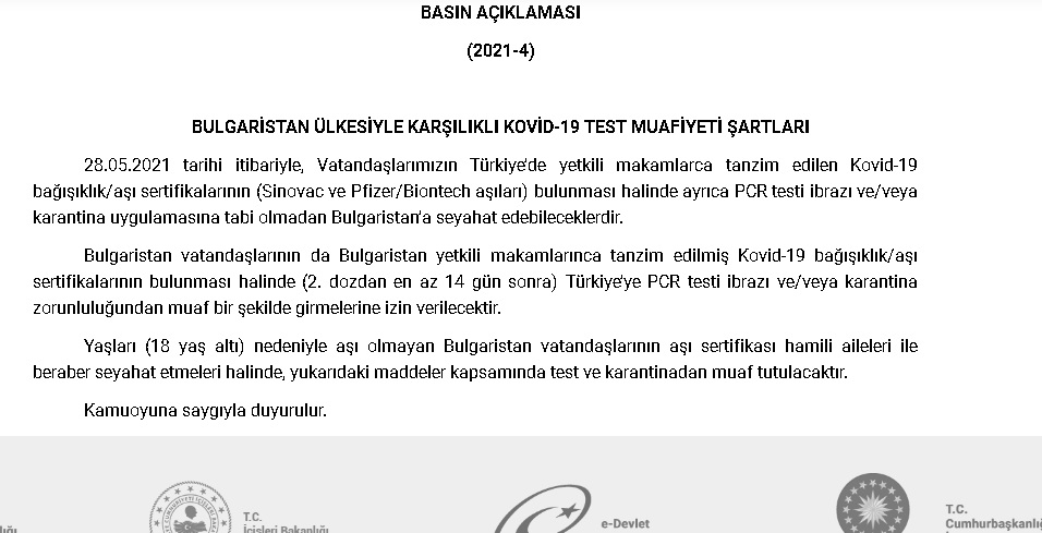 28.05.2021 tarihi itibariyle, Vatandaşlarımızın Türkiye’de yetkili makamlarca tanzim edilen covid-19 bağışıklık/aşı sertifikalarının (Sinovac ve Pfizer/Biontech aşıları) bulunması halinde ayrıca PCR testi ibrazı ve/veya karantina uygulamasına tabi olmadan Bulgaristan’a seyahat edebileceklerdir.