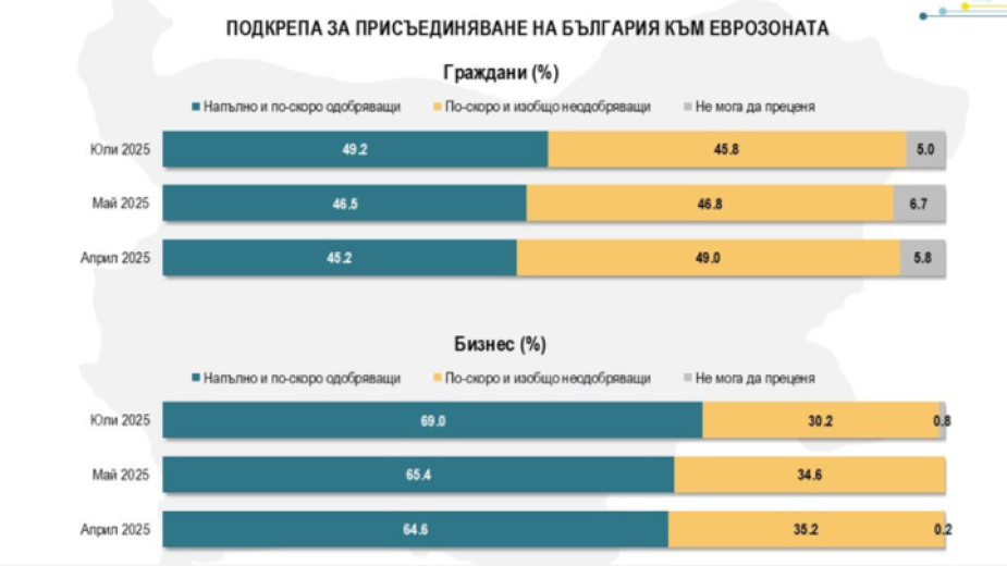 Maliye Bakanlığı’nın isteği üzere “Alpha Research” sosyoloji ajansının, 8-22 Temmuz tarihleri arasında 1200 vatandaş ve 500 iş dünyası temsilcisi arasında ülkenin Avro bölgesine katılımına yönelik kamuoyunun tutumlarının izlenmesi çerçevesinde gerçekleştirdiği kamuoyu araştırması, Bulgaristan vatandaşlarının yüzde 49,2’sinin Avro bölgesine girişi desteklediğini, yüzde 45,8’inin ise karşı olduğunu gösteriyor.