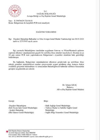 Yayınlanan genelgeye göre; Sinovac ve Pfizer/Biontech aşılarını yaptıran Bulgaristan vatandaşlarının Türkiye’ye girişlerinde aşı sertifikası ibraz etmeleri halinde (2. dozdan en az 14 gün sonra) PCR testi yaptırmaksızın Türkiye’ye giriş yapabileceklerdi.